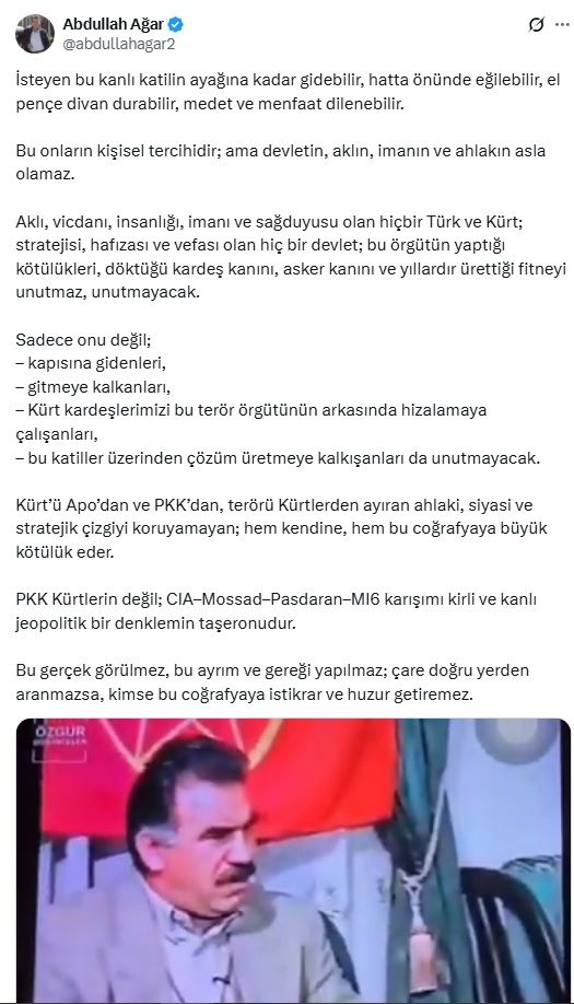 Terör örgütü PKK'yla mücadelede komutanlığını yaptığı timden askerlerin şehit düştüğü ve kendisinin de yaralandığı gazi emekli subay Abdullah Ağar, TBMM Milli Dayanışma, Kardeşlik ve Demokrasi Komisyonu'nun İmralı ziyaretinin büyük bir hata olduğunu söyledi. Ağar, sosyal medya platformu X'ten görüşlerini paylaştı; “Egemenlik Paylaşımı isteyen” bu katiller üzerinden çözüm üretmeye kalkışanlar unutulmayacak” dedi.