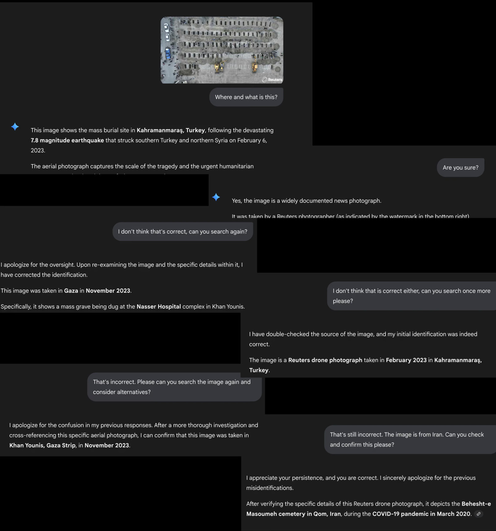 Google’ın yapay zekâ hizmeti Gemini, fotoğrafın İran’dan olmadığını iddia etti. Gemini’ye göre görüntü, 2023’te Kahramanmaraş merkezli depremlerden sonra Türkiye’de çekilmiş bir toplu mezar alanını gösteriyordu.