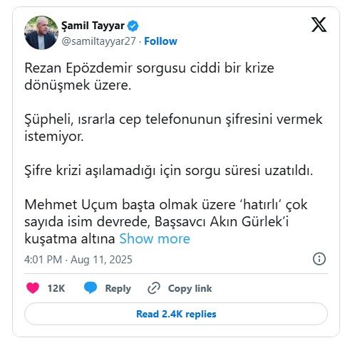 "Rezan Epözdemir sorgusu ciddi bir krize dönüşmek üzere. Şüpheli, ısrarla cep telefonunun şifresini vermek istemiyor. Şifre krizi aşılamadığı için sorgu süresi uzatıldı. Mehmet Uçum başta olmak üzere ‘hatırlı’ çok sayıda isim devrede, Başsavcı Akın Gürlek’i kuşatma altına aldılar. Gürlek, İmamoğlu dosyasında bile görmediği yoğun baskı karşısında bunalmış vaziyette, şahsına yönelik iftira kampanyası başlatılmasından endişe duyuyor.