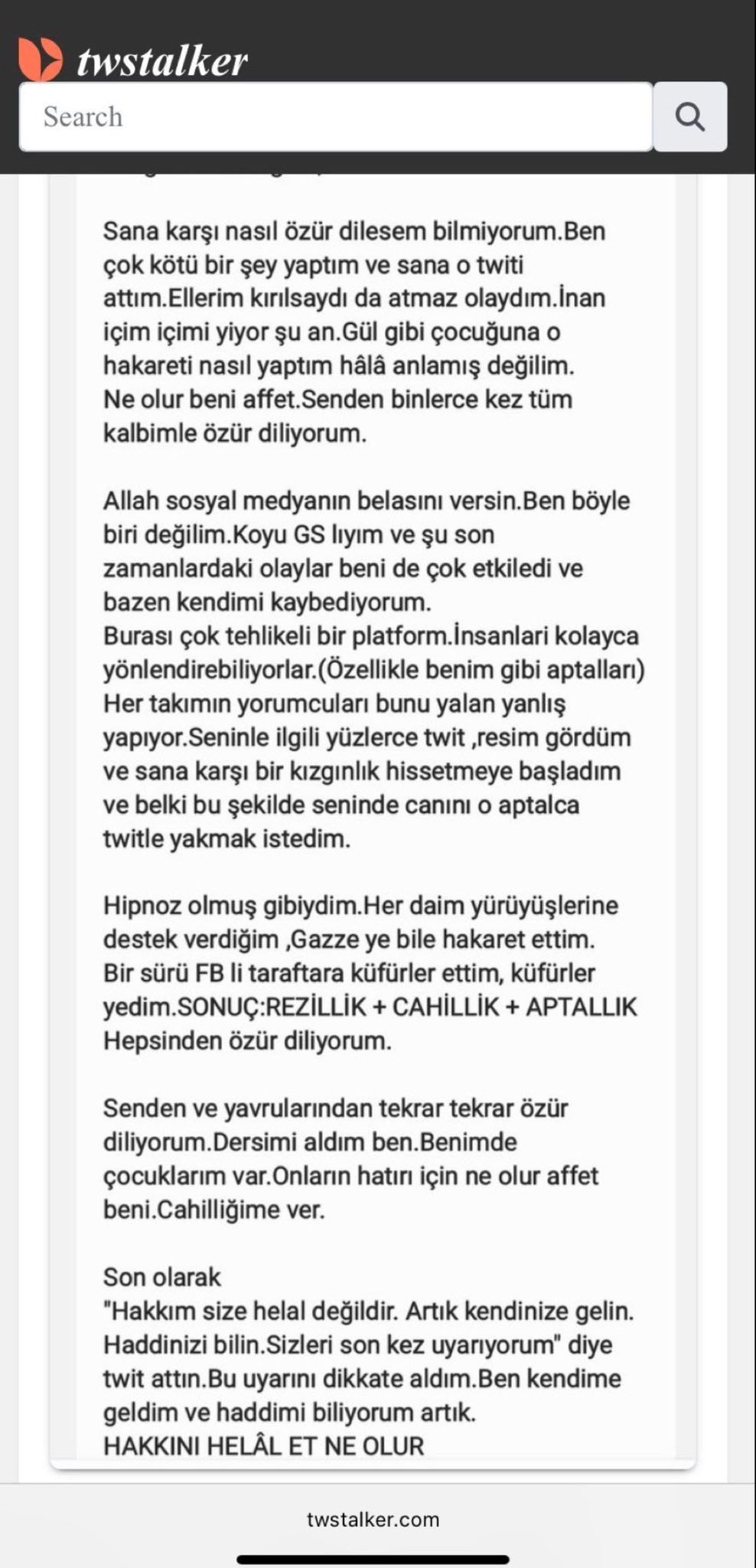 "Sana karşı nasıl özür dilesem bilmiyorum. Ben çok kötü bir şey yaptım ve sana o twiti attım. Ellerim kırılmıştı da atmaz olaydım. İnan içim içimi yiyor şu an. Gül gibi çocuğuna o hakareti nasıl yaptım hâlâ anlamış değilim. Ne olur beni affet. Senden binlerce kez kalbimle özür diliyorum.