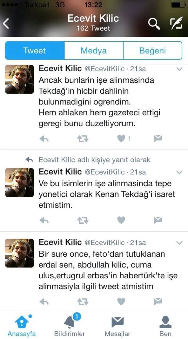 Gerçekten de Ecevit Kılıç, yaklaşık bir yıldır süren işsizlik döneminin ardından Kenan Tekdağ aleyhinedeki tweetlerini silerek sosyal medyadan şunları yazmıştı: "Bir süre önce Fetö'den tutuklanan Erdal Şen, Abdullah Kılıç, Cuma Ulus, Ertuğrul Erbaş'ın Habertürk'te işe alınmasıyla ilgili tweet atmıştım. Ve bu isimlerin işe alınmasında tepe yöneticisi Kenan Tekdağ'ı işaret etmiştim. Ancak bunların işe alınmasında Tekdağ'ın hiçbir dahlilin bulunmadığını öğrendim. Hem ahlaken hem gazeteci etiği gereği bunu düzeltiyorum."