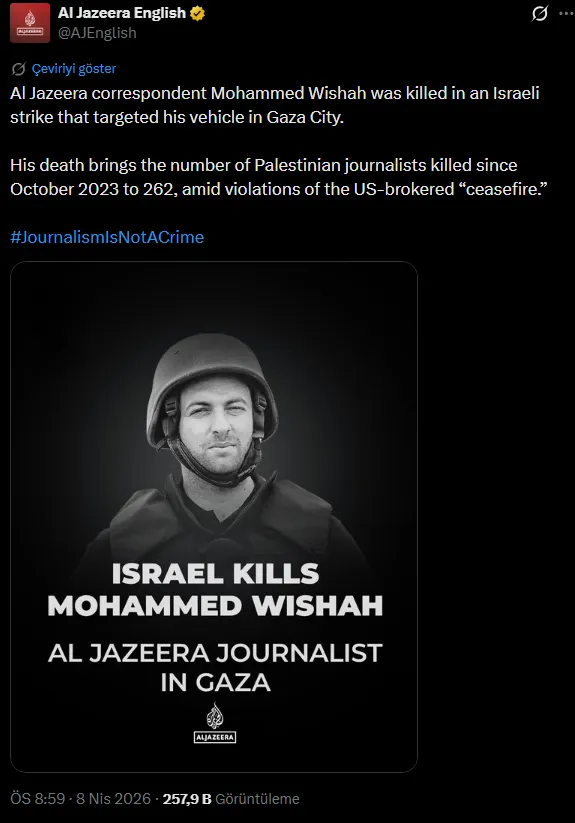 İsrail, Gazez'de bir gazeteciyi daha katletti. Katar merkezli Al Jazeera televizyonundan yapılan açıklamada, dün Gazze Şeridi'nin batısında seyahat ettiği aracın hedef alınması sonucu Al Jazeera Mubasher'in muhabiri Muhammed Samir Vişah'ın hayatını kaybettiği belirtildi.