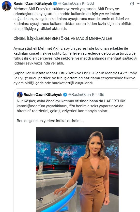 Dizi ve sinema oyuncuları ile şarkıcılara yönelik olarak başlayan ardından medya çalışanlarını da kapsayacak şekilde genişletilen "uyuşturucu soruşturması" kapsamında Habertürk TV Genel Yayın Yönetmeni Mehmet Akif Ersoy dün gözaltına alınmıştı. Habertürk TV'de bulunan Ersoy, jandarma ekipleri tarafından kanal binasında gözaltına alındı.