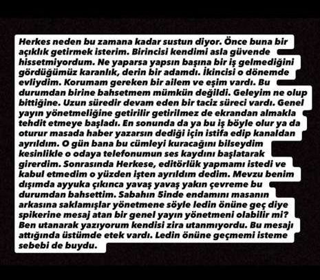 “Herkes neden bu zamana kadar sustun diyor. Önce buna bir açıklık getirmek isterim. Birincisi kendimi asla güvende hissetmiyordum. Ne yaparsa yapsın başına bir iş gelmediğini gördüğümüz karanlık, derin bir adamdı. İkincisi o dönemde evliydim. Korumam gereken bir ailem ve eşim vardı. Bu durumdan birine bahsetmem mümkün değildi. Geleyim ne olup bittiğine. Uzun süredir devam eden bir taciz süreci vardı. Genel yayın yönetmenliğine getirilir getirilmez de ekrandan almakla tehdit etmeye başladı. En sonunda da ya bu iş böyle olur ya da oturur masada haber yazarsın dediği için istifa edip kanaldan ayrıldım. O gün bana bu cümleyi kuracağını bilseydim kesinlikle o odaya telefonumun ses kaydını başlatarak girerdim. Sonrasında Herkese, editörlük yapmamı istedi ve ben kabul etmedim o yüzden işten ayrıldım dedim. Mevzu benim dışımda ayyuka çıkınca yavaş yavaş yakın çevreme bu durumdan bahsettim. Sabahın 5’inde endamım masanın arkasına saklanmışlar yönetmene söyle ledin önüne geç diye spikere mesaj atan bir genel yayın yönetmeni olabilir mi? Ben utanarak yazıyorum kendisi zira utanmıyordu. Bu mesajı attığında üstümde etek vardı. Ledin önüne geçmemi isteme sebebi de buydu.”