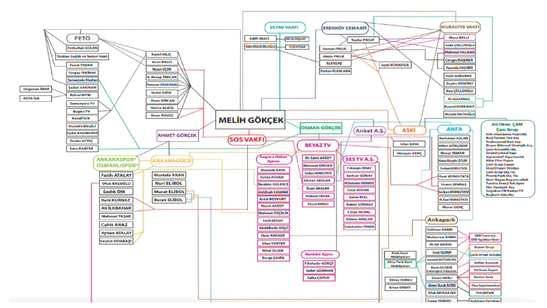 Ankara Büyükşehir Belediyesi tarafından paylaşılan Gökçek ve ilişkiler ağını gösteren şema.‘Tık’ yok: 100’e yakın dosya sıfır etkin soruşturma