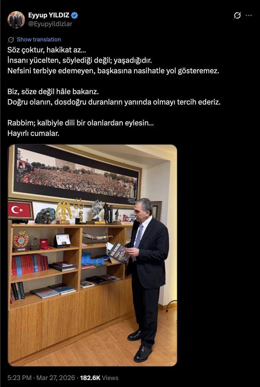 Eyup Yıldız, bugün yaptığı sosyal medya paylaşımında “Biz, söze değil hâle bakarız. Doğru olanın, dosdoğru duranların yanında olmayı tercih ederiz” ifadelerini kullanmıştı.