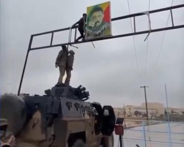 Suriye askerleri, Türk yapımı COBRA ile sokaklarda hainler güruhunun duvarlara ve ilçe girişlerine astığı bölücü başı bebek katili Abdullah Öcalan'ın posterleri ile terör örgütü PKK/YPG/SDG paçavralarını temizlemeye başladı.