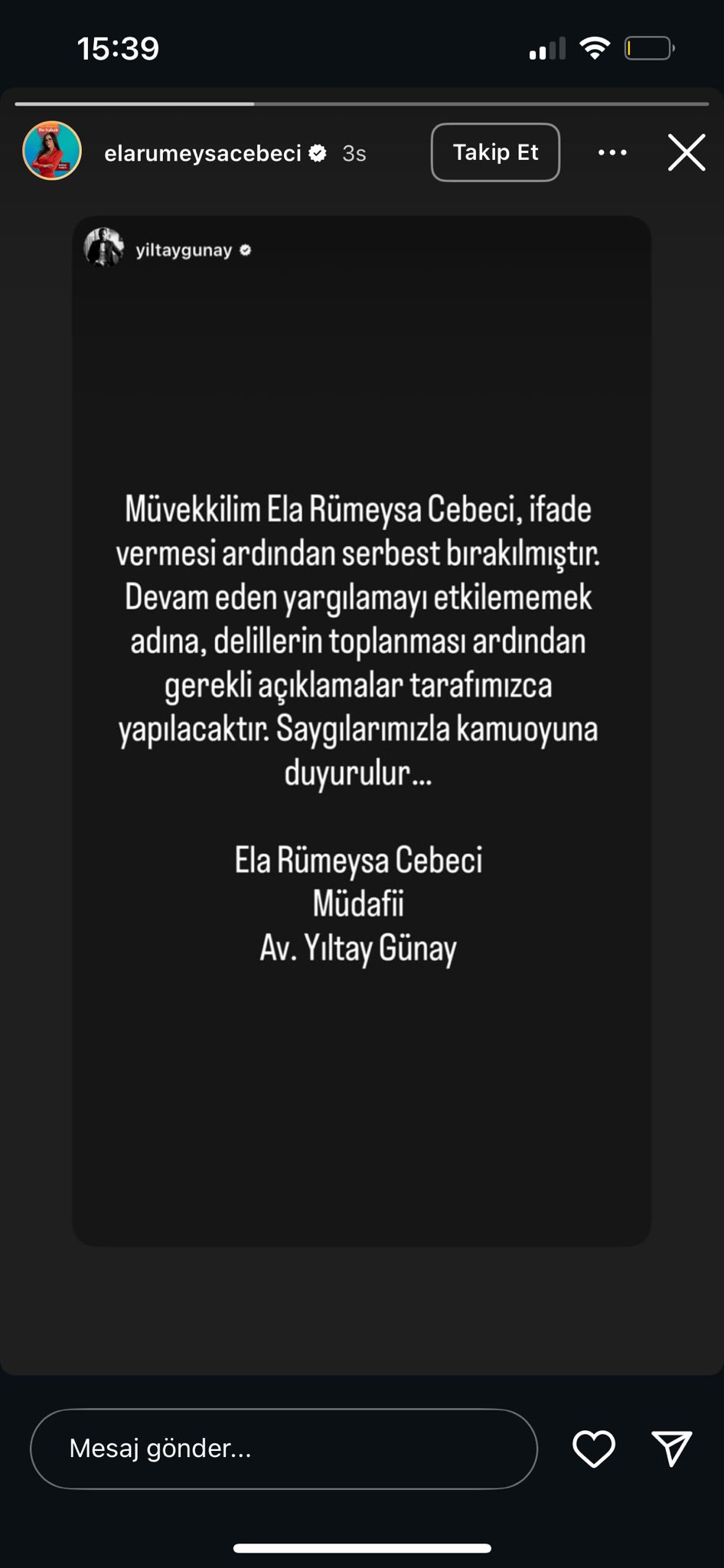 Ela Rümeysa Cebeci'nin avukatı da ifade işleminin ardından serbest bırakıldığını belirtti ve "Yargılamayı etkilememek adına delillerin toplantması ardından gerekli açıklamalar yapılacaktır" dedi.